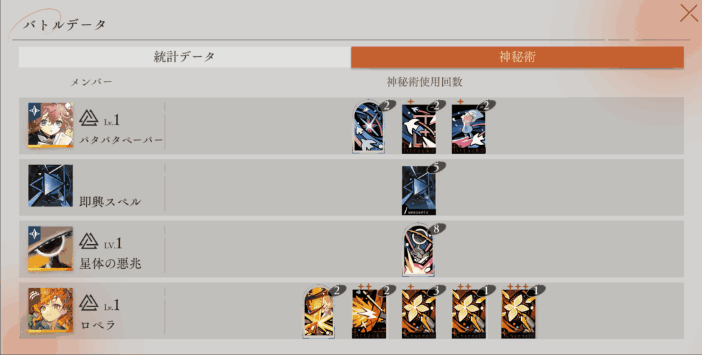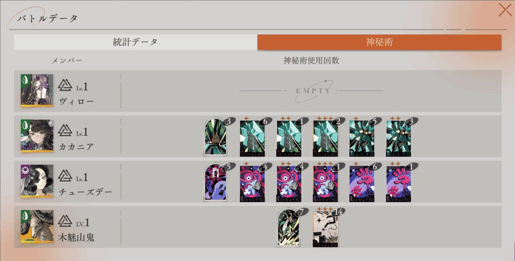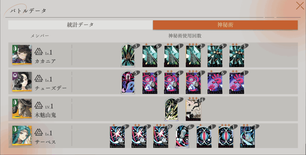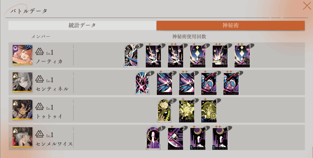 | 1 | ノーティカ | 洞察III Lv.1 | 5 | Lv.10 平穏 | 心の墓碑銘 Lv.60/60 心相増幅Lv.5 |