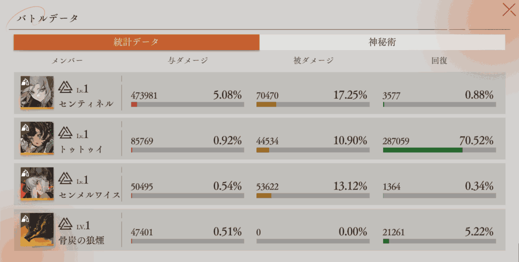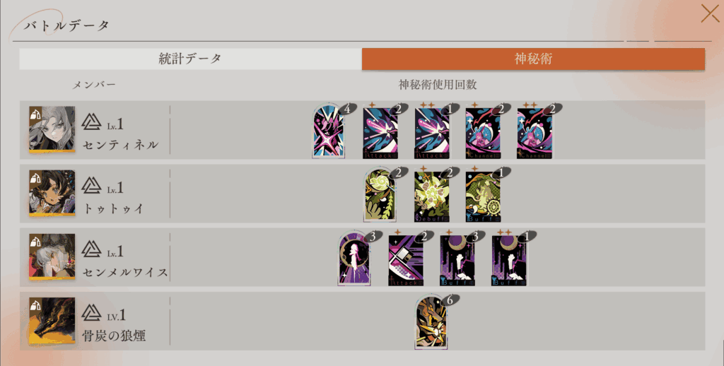 | 2 | センチネル | 洞察III Lv.1 | 0 | Lv.10 平穏 | 帰郷の追悼 Lv.60/60 心相増幅Lv.1 |