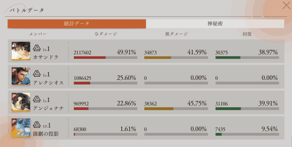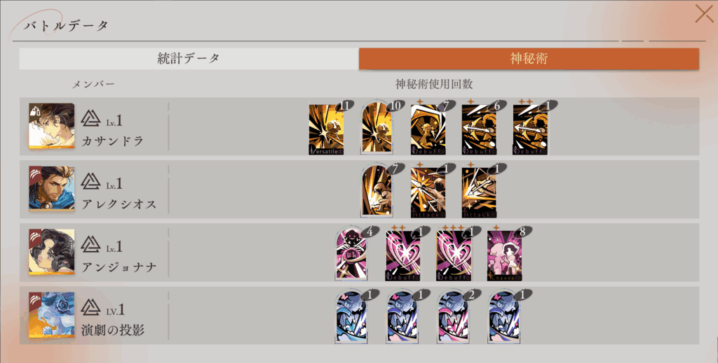| 2 | カサンドラ | 洞察III Lv.1 | 5 | Lv.10 平穏 | 叙事詩の終焉 Lv.60/60 心相増幅Lv.5 |